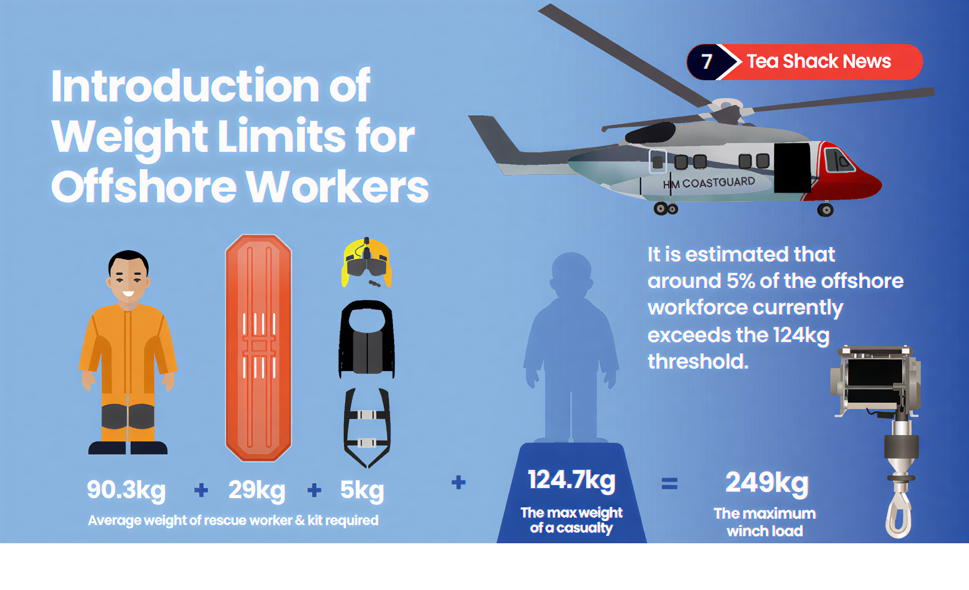 The clothed weight limit for offshore workers is 124kg, including a 0.7kg margin.